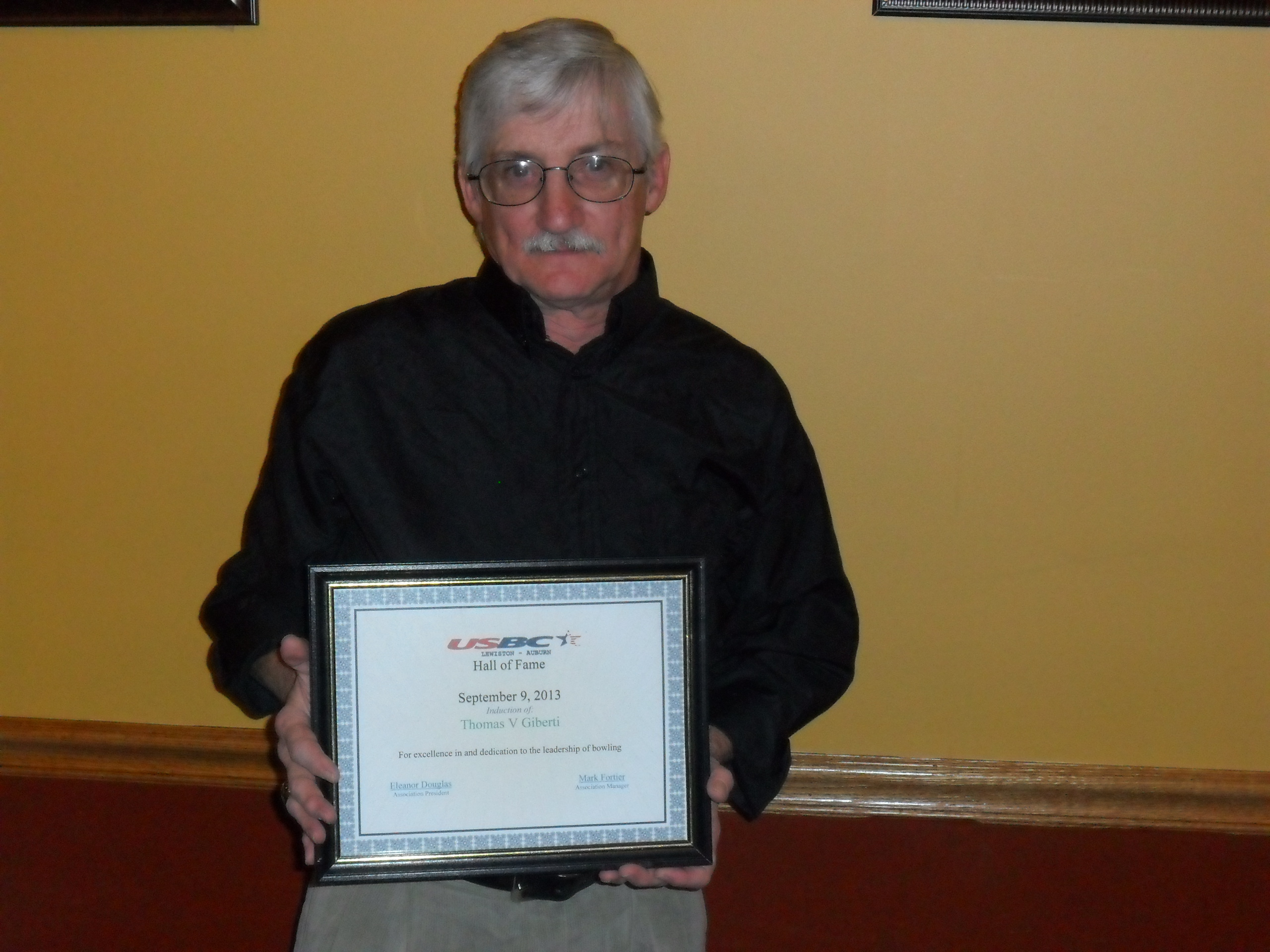 Tom Giberti Sr was inducted into the Lewiston Auburn USBC Hall of fame on November 9, 2013. Thom has served faithfully as the association vice president since the merger as well as the LABA president prior to the merger. Thom also has served as the president of the Northwood Park league on Monday nights for many years. On the lanes, Thom has turned in two 700 series and registered a lifetime high season ending average of 197 in the 2011-2012 bowling season while bowling in the Northwood Park league.